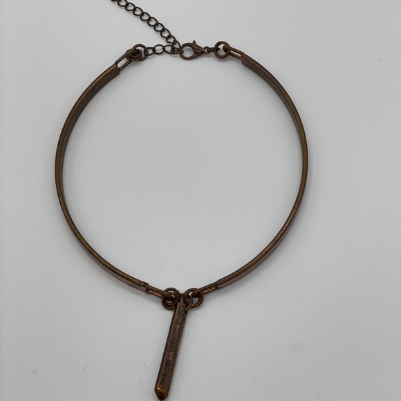 Choker bronze in color with straight hanging piece in front. Clasp to hook together.