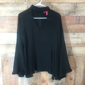 Black choker neck top. Long flutter sleeves. Back hidden zip with hook & eye closure. Size XS. Sharkbite hem is approx. 26" shortest and 28" longest length. 100% poly.