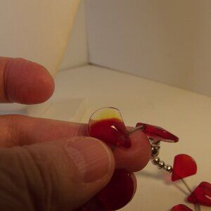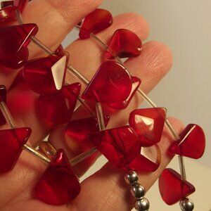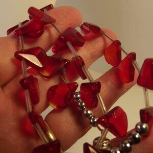 15 inches long - magnetic clasp - red faceted teardrop glass bead/charms with long bugle bead separating each one.