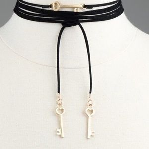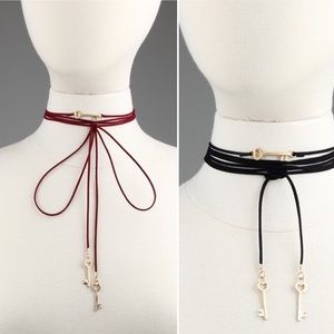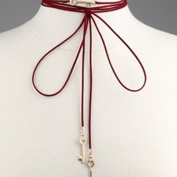 Tie neck key choker in burgundy and black. Can be worn in a variety of ways.
