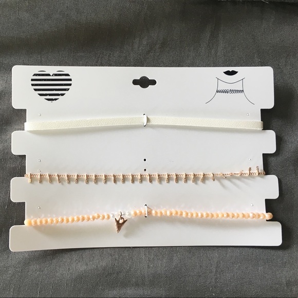 These 3 chokers are brand new! The top one is white leathery material with a rose gold clasp in the back. The middle one is rose gold, and the bottom one has peachy beads with a rose gold charm that sits in between 4 clear beads. They are the perfect accessory!