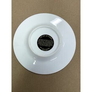 This decorative plate featuring a calla lily design made using the Art of Chokin technique. This Japanese metal engraving art form typically involves etching images onto metal plates, often using gold and silver to create intricate designs. In this instance, the calla lilies are depicted in silver and gold against a white porcelain background, surrounded by a gold rim.