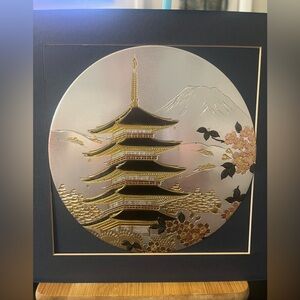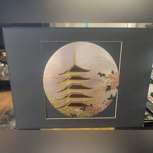The artwork depicts a traditional Japanese pagoda, cherry blossoms, and Mount Fuji in the background inside a frame approx. 8x12.5”