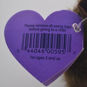 Chompers the brown beaver Puffkins brown and tan with a brown quilted flat tail. Chompers has brown eyes and 2 white buck teeth. Made by Swibco, this retired beaver Puffkin is style #6608 with a birthday of February 5, 1997.