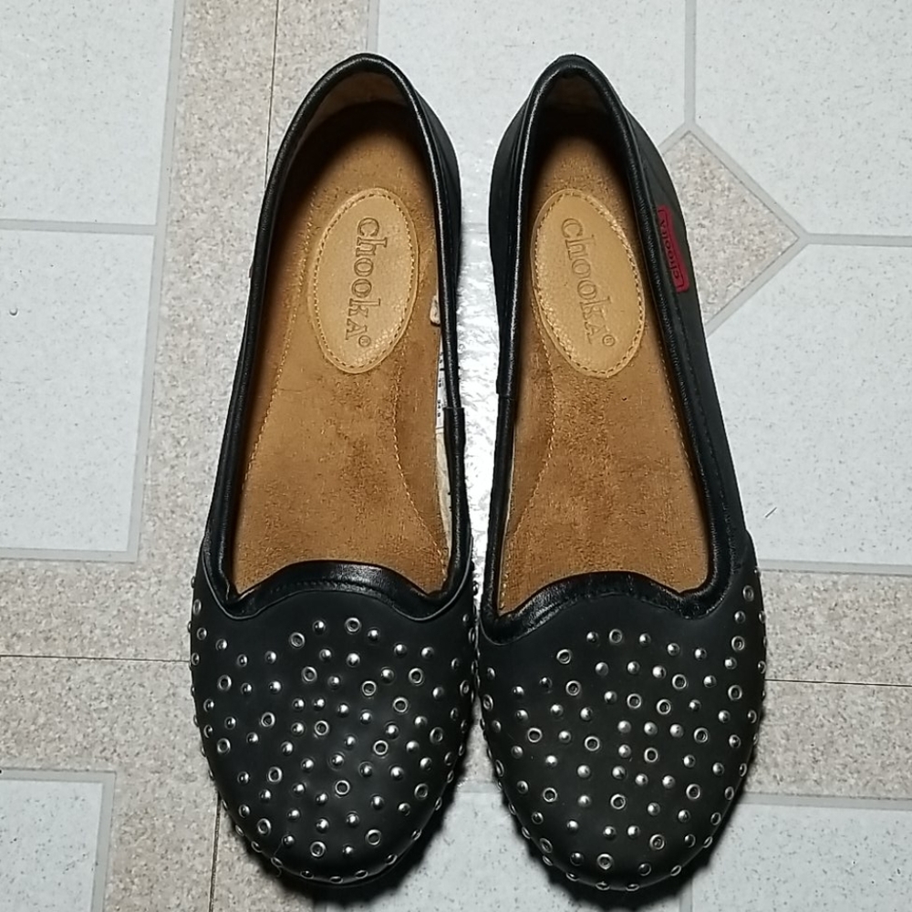 Black flats with studs on the toes. Only worn twice.