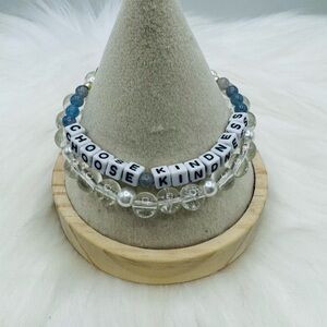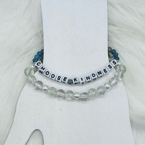 This set includes one 8mm clear beaded bracelet and one 4mm mini Choose Kindness beaded bracelet. With elasticity to fit most wrist sizes, these bracelets serve as a gentle reminder to choose kindness.