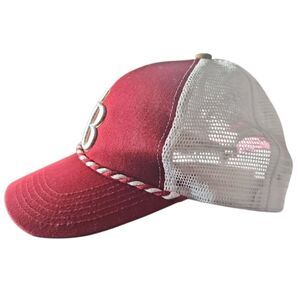 Maroon trucker cap features raised “TB” embroidery, a twisted rope accent, and retro snapback styling