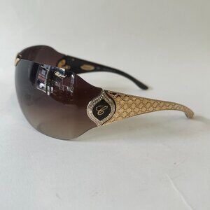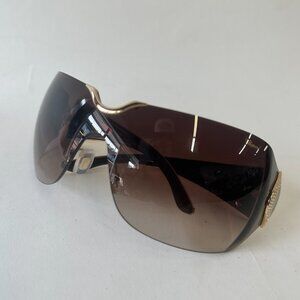 Experience pure luxury with these stunning Chopard shield sunglasses — a rare designer piece that combines elegance, sophistication, and glamour. Featuring a dramatic oversized brown gradient lens and rich gold-tone temples adorned with intricate detailing and crystal embellishments, these are the ultimate statement shades.