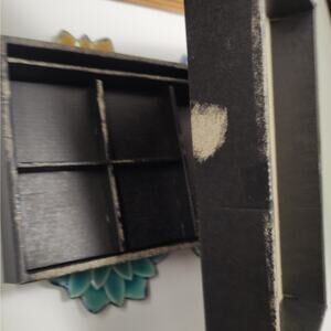 First photo shows exactly what is included in the set. The only thing missing is the blue string that ties around the blue chopsticks. No chips, scratches, or cracks on the plates, excellent condition. The box was previously taped shut so the exterior shows tearing(see the last 2 photos).