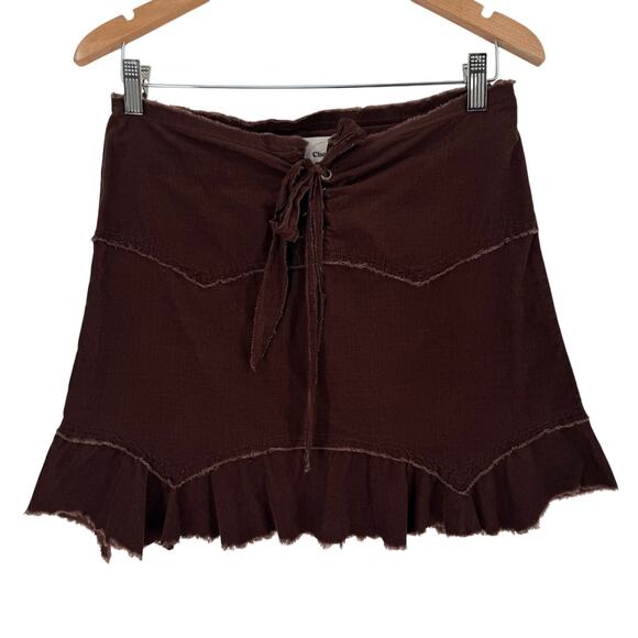 Stylish brown mini skirt by Chor. Features a tie front and ruffled hem. Perfect for casual outings.