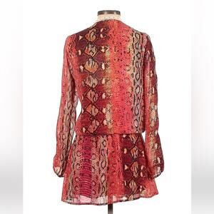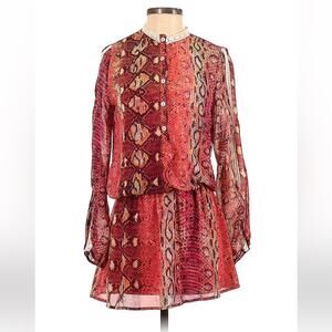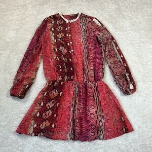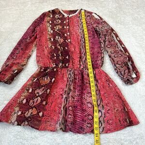 Chiffon dress in sheer pink and brown python print, with hot pink slip liner. Features crocheted neckline with button down front, crochet detail along sheer sleeves, elastic at wrists and waist. There are no pockets, and a nice amount of stretch.