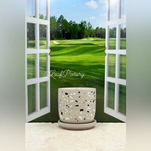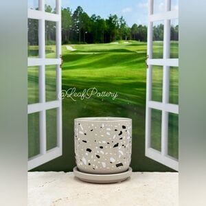 Dimensions: 4.5”H x 4.5”W, Opening 4”, Weight 1lbs 9.3oz, Drainage hole, saucer attached to the planter, Color : Beige, Black & White, Material: Ceramic, Type: Barrel Planter , Made in China, Perfect for Indoor/Outdoor gardening, Don’t forget to dress up your plants 🪴
