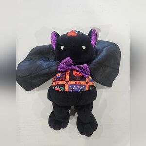 Adorable Vintage Halloween bat plush toy. Its vibrant black and purple colors make it a fun and spooky companion for playtime or as a fun decor piece.