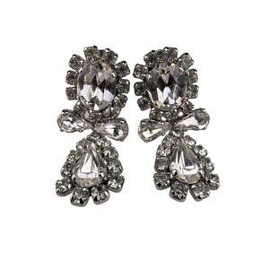 These Chr. Germany vintage clip-on earrings exude timeless elegance and sophistication. Made in Germany, they showcase a silver-tone metal setting adorned with rhinestones in a teardrop and oval design, capturing the glamour of mid-20th-century fashion. The intricate craftsmanship is evident in each dazzling stone, reflecting a luxurious and vintage appeal. The clip-on style makes them wearable for those without pierced ears. A heart motif at the clasp adds a charming detail to their design, while the stamped marker confirms their authenticity. With delightful sparkle and classic allure, these earrings reflect the refined quality of Christian Dior accessories, making them a valuable collector’s item or statement piece.
