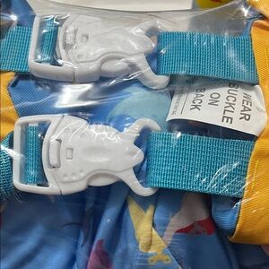 Yellow swim vest with dinosaur print. Blue straps with colorful fish Dinosaur Ready for Vacation