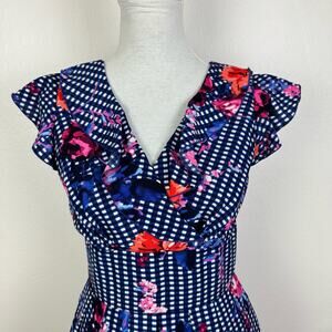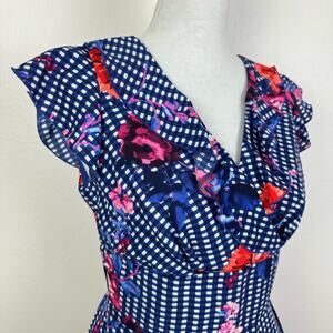 Chris McLaughlin | Blue White Checker Pink Floral Ruffle V-Neck Cap Sleeve Dress