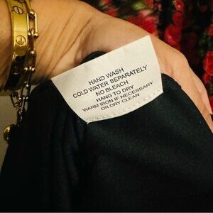 This dress is so cute. It has tiny ruffles around the arm holes, neck line and across the bust. There are pleats across the chest and the upper back. It is lined. Great condition.