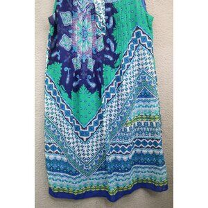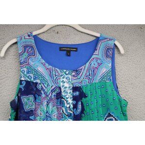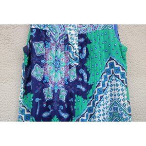 This is a Chris McLaughlin Sleeveless Chiffon Dress that is a size 6. It is lined. It has buttons in the front. It is 100% Polyester. Laying flat, it measures: Armpit to armpit-19" and the Length is 37". It is in great condition.