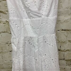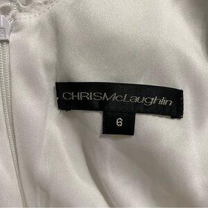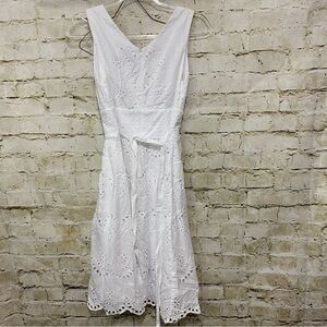 Chris McLaughlin Womens Size 6 White Lazer Cut Lace V Neck Belted Dress in good used condition. No stains, tears or rips.