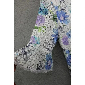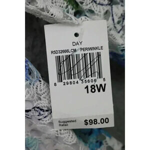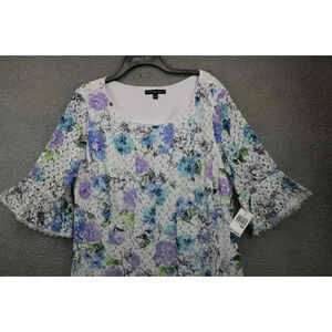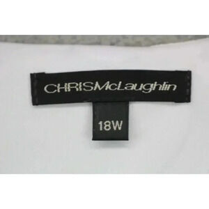 This is a Chris McLaughlin Women's Lacey Dress that is a size 18W. It is New with Tags. It retails for $98. It is white with purples and blues. It is 100% Polyester. It is lined. Laying flat, it measures: Armpit to armpit-23" and the length is 41". It is a very pretty dress.