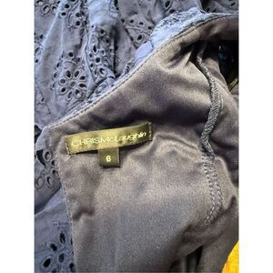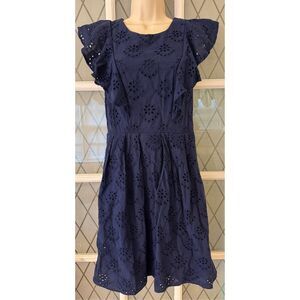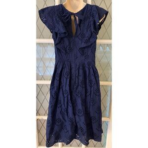 Chris McLaughlin Women's Flutter Sleeve Eyelet Ruffle Front Navy Blue Dress 6.