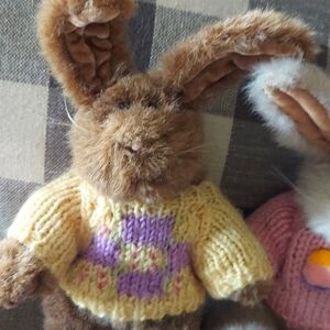 Adorable plush bunny pair featuring cozy sweaters in yellow and pink. Perfect for small pet companionship or as a charming decor piece.