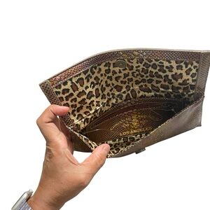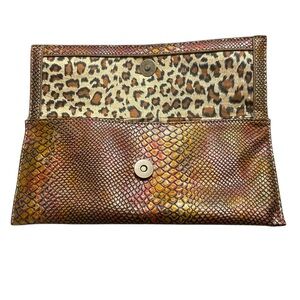 The Christian Audigier bag is a vintage-inspired rectangular clutch made of faux leather with a unique brown and red exterior color. It features a zip closure, inner pockets, and copper hardware. This stylish handbag is designed for women and does not offer personalized customization. The brand's reputation for quality and fashion-forward designs is reflected in this chic and eye-catching accessory.