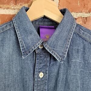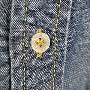 Button-up chambray shirt from Christian Audigier Kids. Audigier is best known for his Ed Hardy brand and this shirt is very much giving Ed Hardy. The front features one chest pocket and a green metallic foil CA monogram. The back has green foil text with a jaguar done in tattoo art. Short-sleeves. Embossed buttons. An extra button is attached to the inner seam garment tag. Pre-owned with light signs of wear and wash. Remains in great used condition. No visible flaws, holes or stains. In youth size 12.