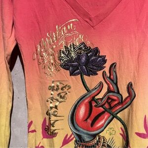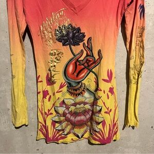 Christian Audigier Y2K Bedazzled Long Sleeve Shirt Size Small S Buddha Lotus