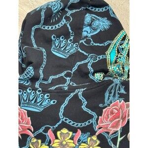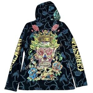 Make a statement with this authentic Y2K-era Christian Audigier Los Angeles hoodie, designed by the creator behind the iconic Ed Hardy line. Featuring bold tattoo-inspired artwork, this hoodie showcases a crowned sugar skull and roses embellished with sparkling rhinestones, with gold script logo detailing down the sleeves.