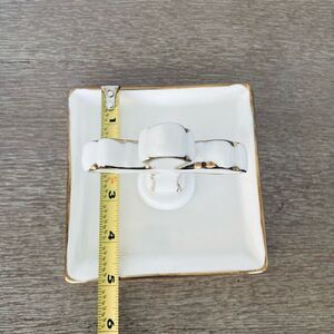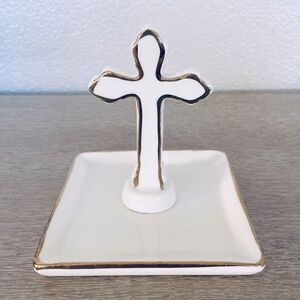 Christian white ceramic cross jewelry or trinket tray with square base and metallic trim. Like new condition.