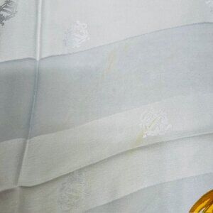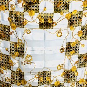 #15) The Christian Dior 100% Silk Scarf is a luxurious accessory featuring a geometric pattern in silver, gray, black, and gold coin block colors. This square scarf 33" 333" is designed for women with a style that is both timeless and bold, perfect for adding a touch of elegance to any outfit. Made from high-quality soft silk chiffon and satin mixed material,