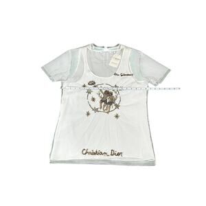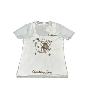 This exquisite Christian Dior 2021–22 Mesh Les Gémeaux Embroidered Top & Tank set blends celestial artistry with timeless Dior craftsmanship. Featuring the “Les Gémeaux” zodiac motif intricately embroidered on sheer mesh, this two-piece ensemble includes a delicate overlay top and matching inner tank—perfect for layering or wearing as a statement piece.