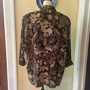 Very nice condition 80’s vintage piece. 100% silk, unlined, lightweight long blazer/jacket. Gorgeous floral pattern with moths/butterflies. Two pockets, rolled up cuffs in contrasting fabric. Shoulder pads, could be carefully cut out because they are not sewn inside of fabric. Or leave them in for the full 80’s vibe!