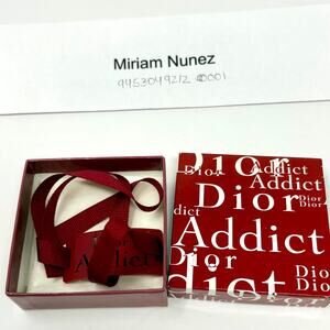 Exclusive Dior Addict red choker featuring a glossy metal cutout logo plate on a matching adjustable ribbon. Comes in its original Dior Addict logo-patterned gift box. Originally distributed as a limited promotional item at Dior beauty events.
