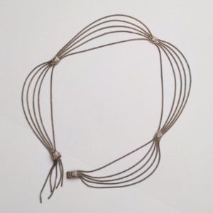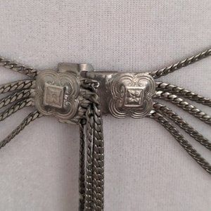Five strands of flat silver chains with small conchos and a hidden clasp. Chains drape beautifully adding a bit of flare to any outfit!