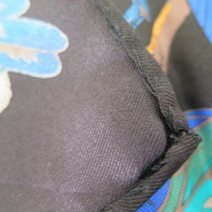 lovely authentic christian dior large silk twill scarf depicting birds in vibrant blues and blacks. hand sewn rolled edges. measures 34"square. excellent condition, with no stains, holes, snags or odors.