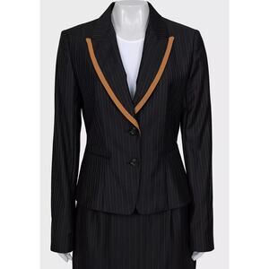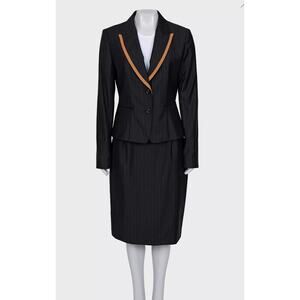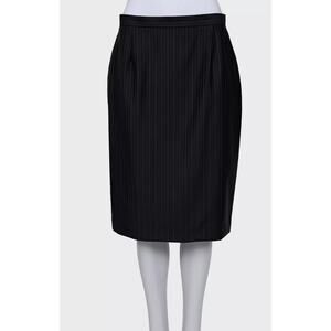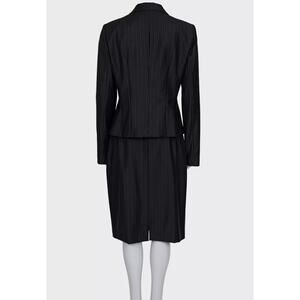 Elevate your wardrobe with this timeless Christian Dior suit. This elegant ensemble features a fitted blazer and skirt, both crafted from luxurious 100% wool with a smooth silk lining. The classic black color with subtle pinstripes exudes Parisian sophistication.