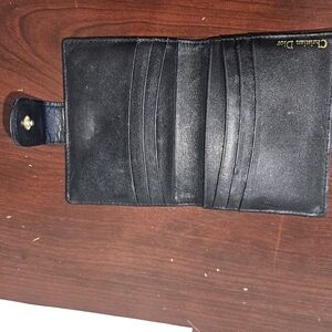 Vintage Dior luxury black leather wallet with red stitching. Features a button closure.