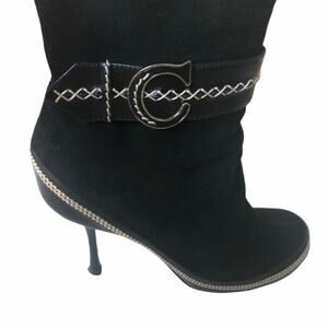Circa 2005 during John Galliano's time at Dior, these black suede and leather booties feature C and D monograms on each bootie, leather and embroidered detail around sole and ankle, interior zip, round toe, approximate heel height 3.5", made in Italy. Excellent preowned condition: signs of wear to sole, heel, and tip of shoe.