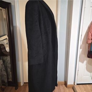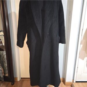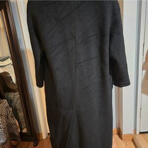 beautiful vintage women's coat black long with pockets on the side 3/4 sleeves beautiful coat I purchase at a state sale it does have some signs of use from age its old in poor condition it is missing the belt overall just needs to be taken to the cleaners please view all photos for better description any questions asked before purchase please remember this item it's not new is a vintage and it has some damage to the material sale as is