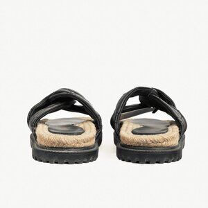 Made in Italy, these DTwist slide sandals from Christian Dior are crafted in a black leather on the upper with a quilted Cannage design, and feature open rounded toes, twisted straps, jute on the insoles, and rubber outsoles.