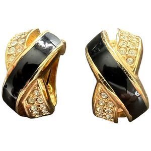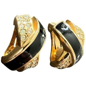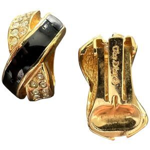 Christian Dior Earrings Gold Tone Black Enamel Crystal Rhinestone Clip On X
