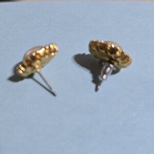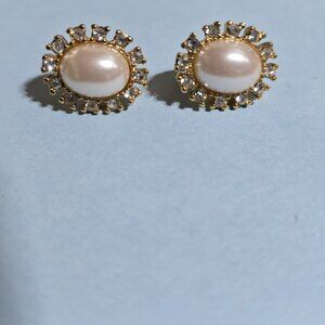 Vintage Christian Dior earrings featuring a central faux pearl surrounded by rhinestones in a gold tone setting.