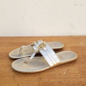DESCRIP: Metallic Gold Thong Sandals with Brass Logo