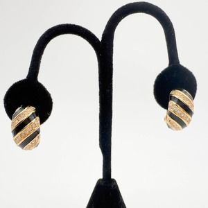 Christian Dior Gold Tone Domed Half Hoop Clip-On Earrings with Black Enamel and Clear Rhinestone Bands