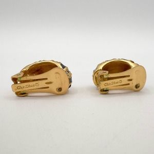 Christian Dior Gold Tone Half Hoop Clip-On Earrings Black Enamel Clear Stones