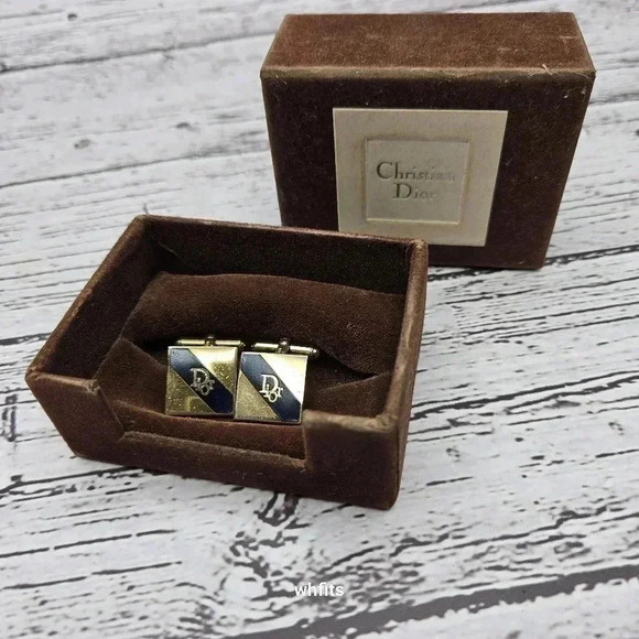 Christian Dior Gold and Navy Blue Cufflinks Vintage with Box in preowned condition. Photos show all areas of normal wear such as scratches, stains and rubbing.