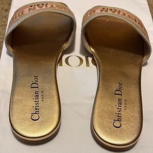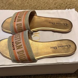 Dior Dway slides in shimmering gold and pink. Iconic logo accent. Purchased from Neiman Marcus and only worn about 5 times. Color is 52k platinum. Size 37. Comes with two dust bags and the original box