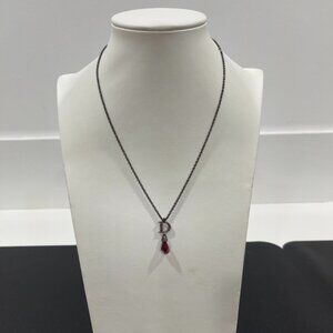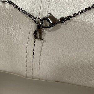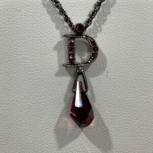This is a beautiful Christian Dior Gunmetal Necklace. This necklace has multiple lengths with the longest being 9 in. The "D" is encrusted with purple crystals and the drop gemstone is beautiful in a purple color. Please look carefully at photos as this is a preloved item.